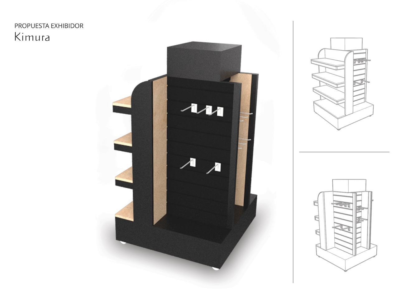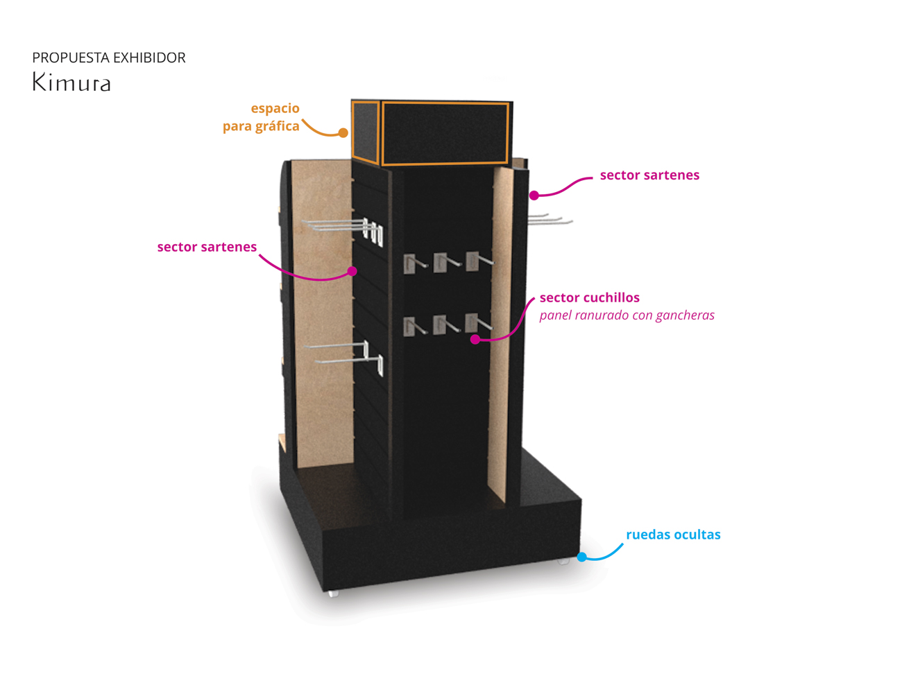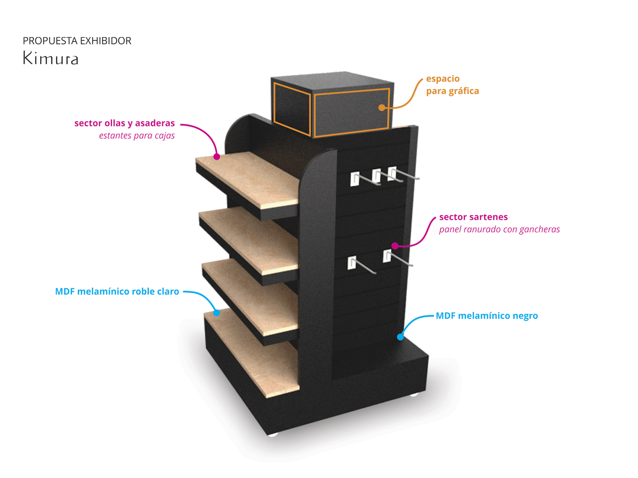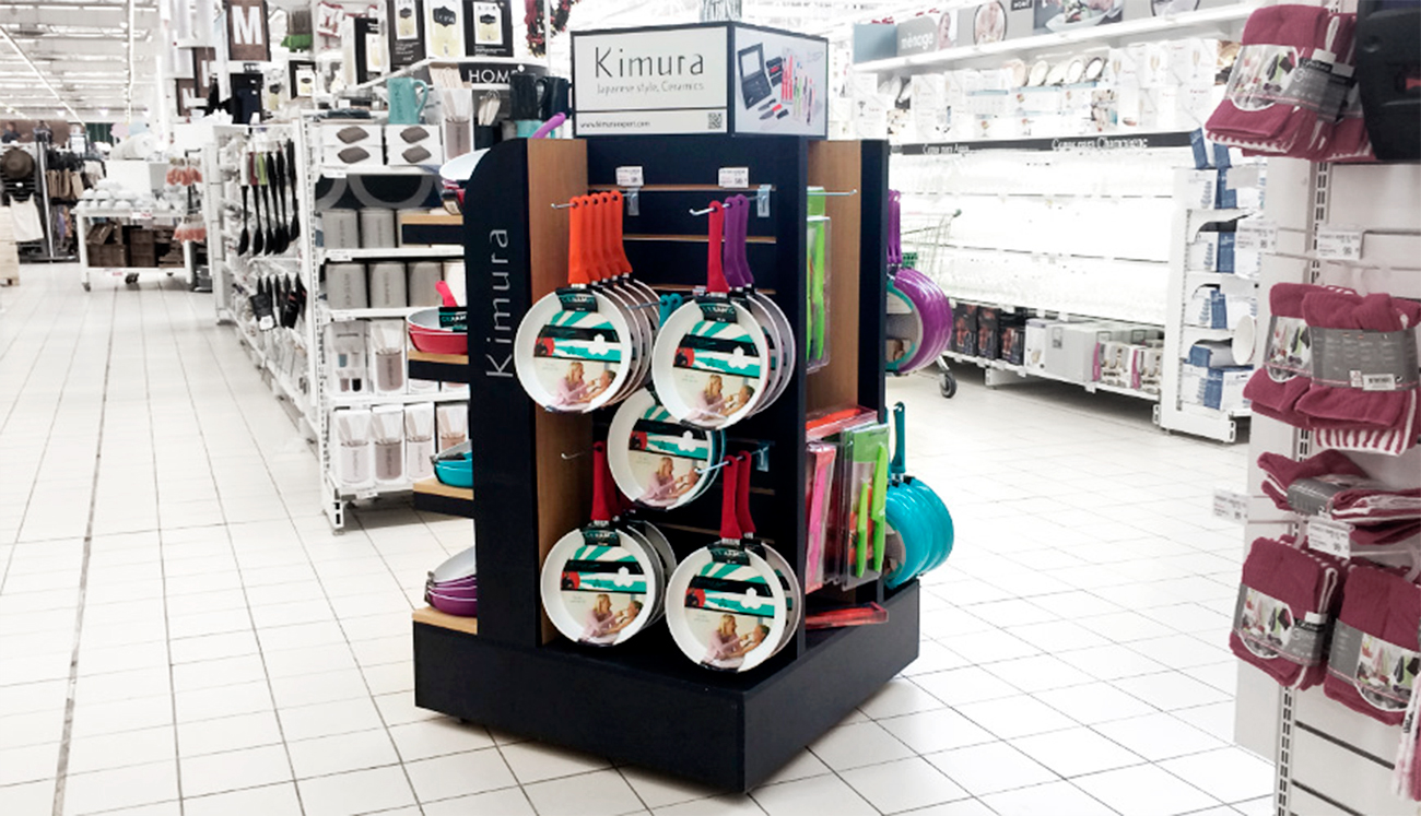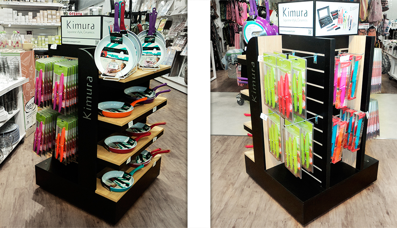 Exhibidor isla para supermercados Se optó por el color negro y la madera para resaltar el colorido de los productos. Contempla espacio para gráfica en laterales y parte superior. Productos a exhibir: cuchillos cerámicos, sartenes y asaderas. Materiales: MDF melamínico